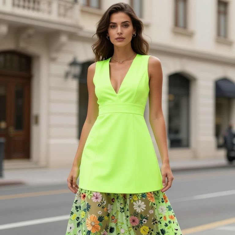 Female wearing a neon green dress with a low neckline and a flowered skirt. She is standing on a street with a building in the background.