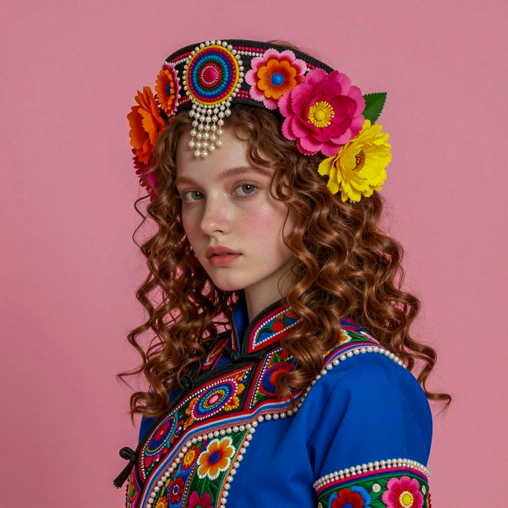 Young woman with pale skin, brown curly hair, wearing a vibrant, multicolored traditional costume with intricate embroidery, flowers, and beads. Headpiece with large pink, orange, and yellow flowers, colorful circular patterns, and pearl accents. Pink background. Neutral facial expression, looking slightly to the side. Upper body shot, facing slightly left.
