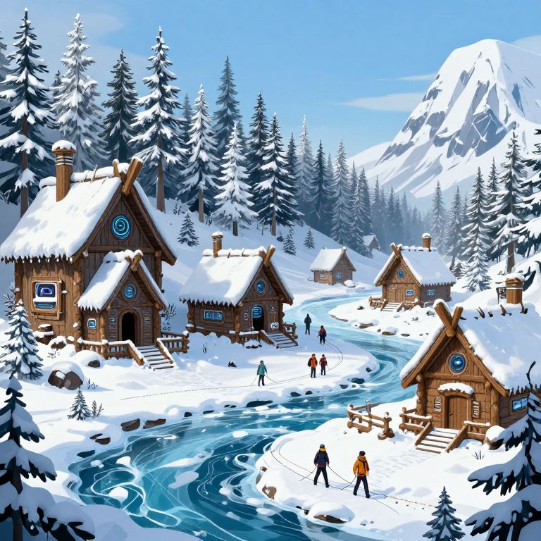 A panoramic view of Treckingrad, combining ancient Nordic design with cyberpunk elements, featuring wooden lodges with futuristic tech, snow-covered forests, and explorers traversing frozen rivers, painted in vibrant cool tones.