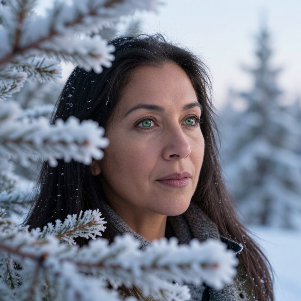 Craft a photorealistic portrait photograph featuring a middle-aged Hispanic woman with captivating green eyes, her enigmatic gaze fixed upon an unseen point in the serene Scandinavian winter landscape. She stands amidst snow-covered evergreens, their icy branches forming an ethereal frame around her face. Soft morning light filters through translucent ice crystals, illuminating her delicate skin and accentuating the natural interplay of light and shadow on her striking features. This hyperrealistic portrait evokes a sense of introspection and tranquility, capturing both the resilience and mystery inherent in this captivating subject within a scene that exudes timeless beauty and serene reflection.