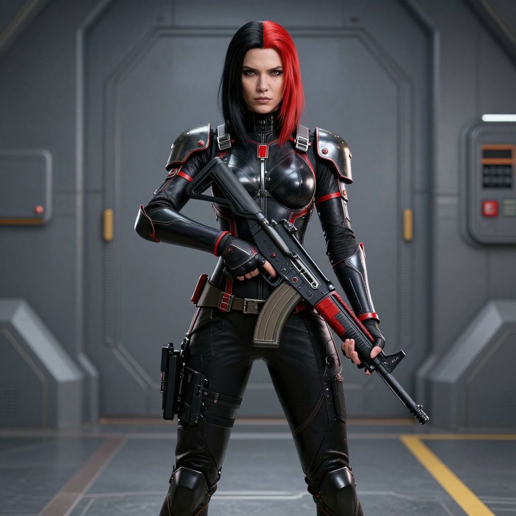 Digital artwork of a tough-looking woman with black and red hair, standing confidently in a futuristic, metallic room. She's wearing shiny black armor with red accents and holding a black assault rifle in front of her. Her expression is serious and focused. The background features gray, industrial-looking walls with various panels and a yellow line on the floor. The overall style is detailed and sci-fi.