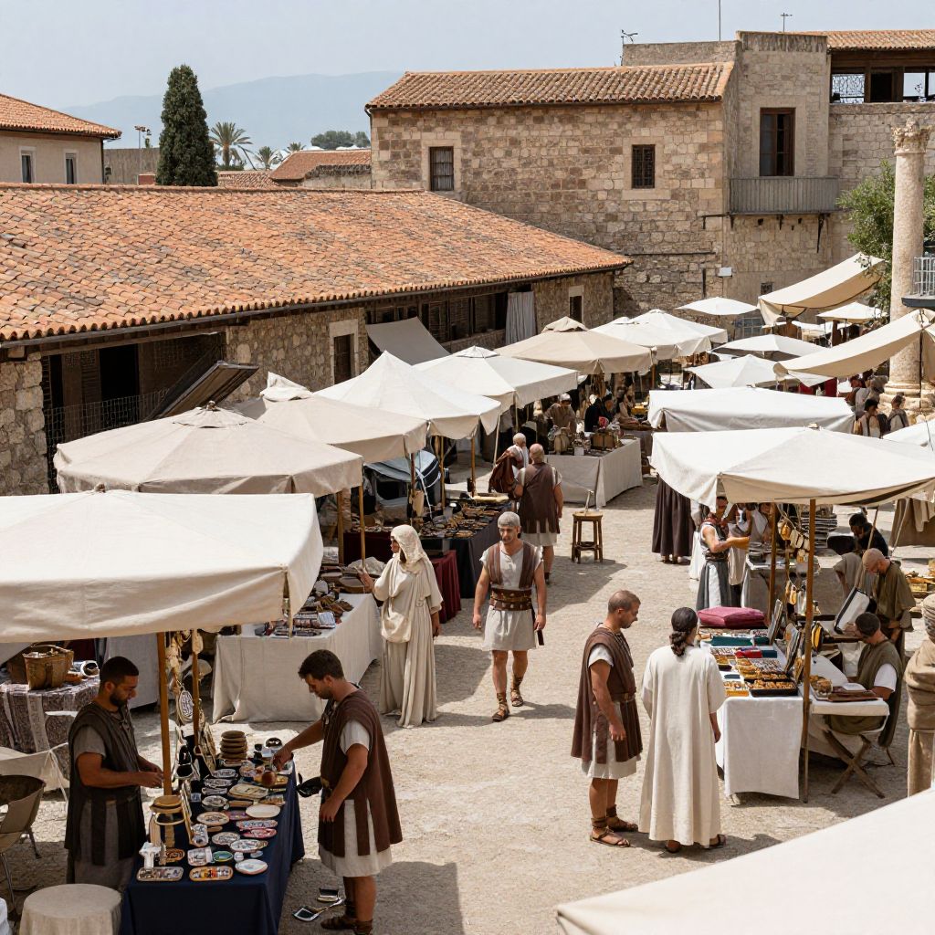 Photograph of a sunny, narrow European market street with stone buildings on either side. Stalls with green and white striped canopies display vibrant oranges, lemons, and other fruits on wooden tables covered with green cloths. Shoppers, including men and women in traditional attire like long skirts and headscarves, walk along the cobblestone path. Flower boxes with red and pink flowers adorn black iron balconies on the buildings. The sky is bright blue with scattered clouds, and the light casts soft shadows, enhancing the historic, rustic atmosphere.