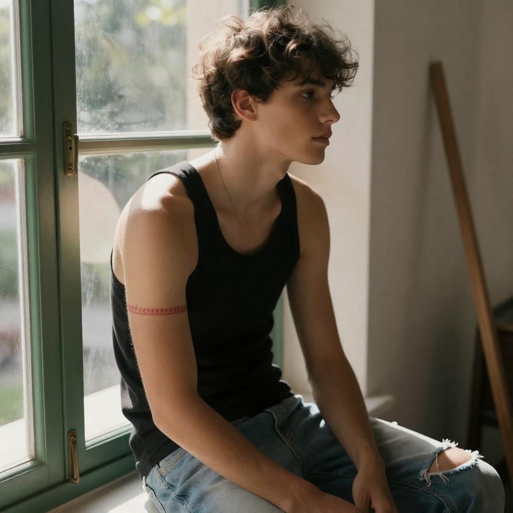 Young man with short brown hair, wearing a black tank top and ripped jeans, sitting in a sunlit window. Right arm has a red tattoo. Window behind shows green-framed exterior. Wooden sticks lean against wall on the right. Sunlight highlights his profile.