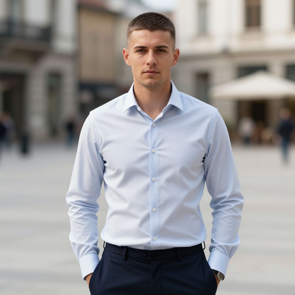 Short Bowl Cut, fit european man, professional European man with a short bowl haircut, wearing a tailored shirt and trousers, standing in a city square, natural light, high-quality portrait