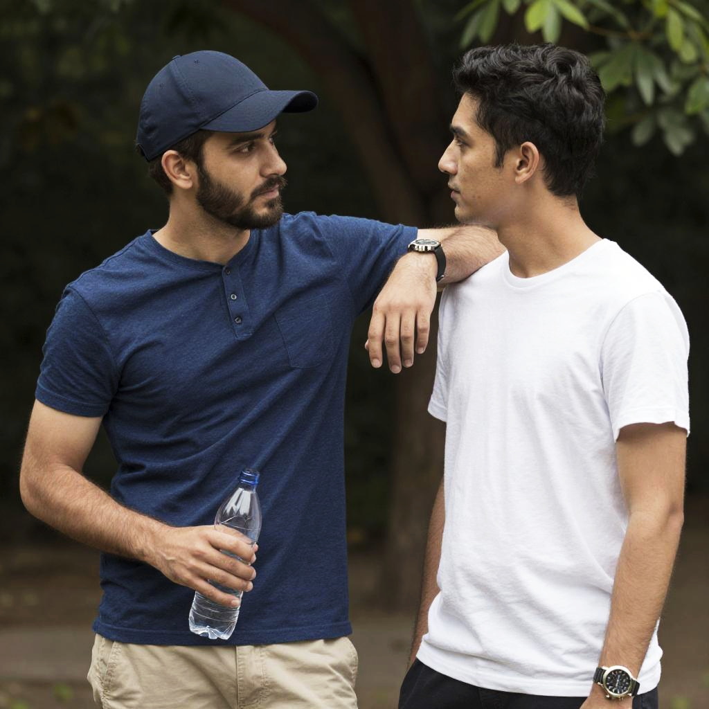Multiple boys, 2boys, facial hair, shirt, outdoors, hat, male focus, watch, wristwatch, tree, realistic, bottle, pants, holding bottle, beard, holding, baseball cap, mustache, looking at another, water bottle, hand on another's shoulder, blue shirt, white shirt, black hair, t-shirt