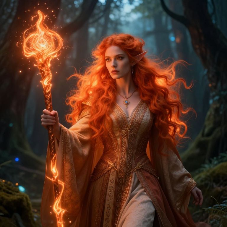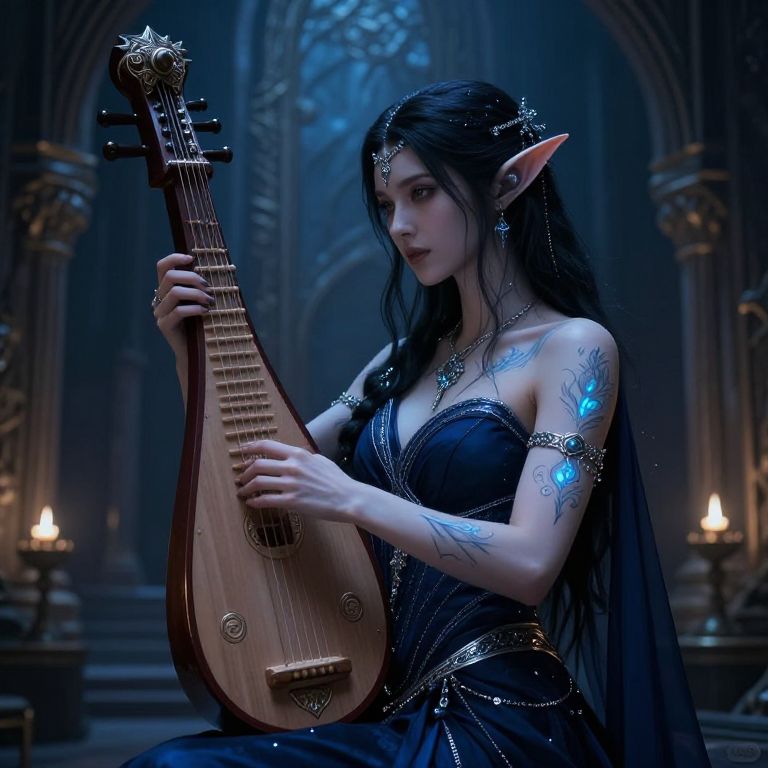 Photorealistic digital art of a red-haired, elven woman with pointed ears, playing a lute in a warm, medieval tavern, surrounded by