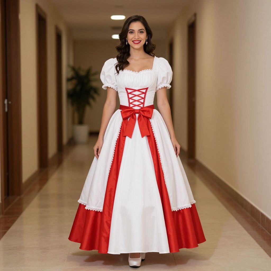 Isabela Encanto Woman Costume, woman in a white and red dress standing in a hallway