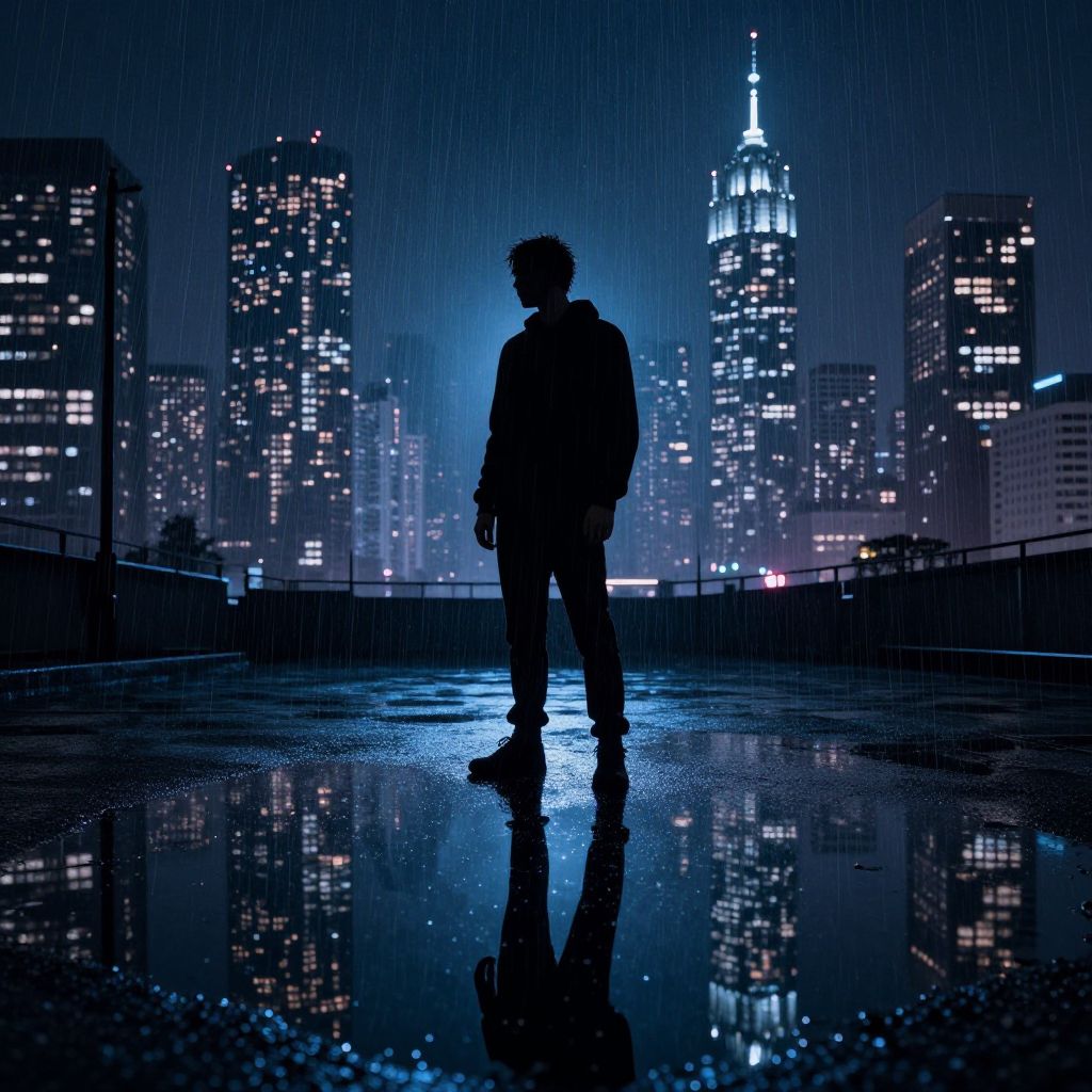 "Ink Transparency Man Standing on a puddle with the reflection of another man, rainy night time, city skylines, synthwave, digital art, 4K,"