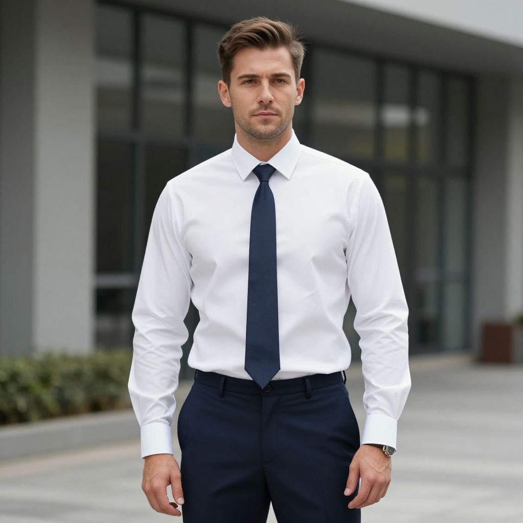 Smart Casual Work Wear Costume, man in a white shirt and tie standing in front of a building