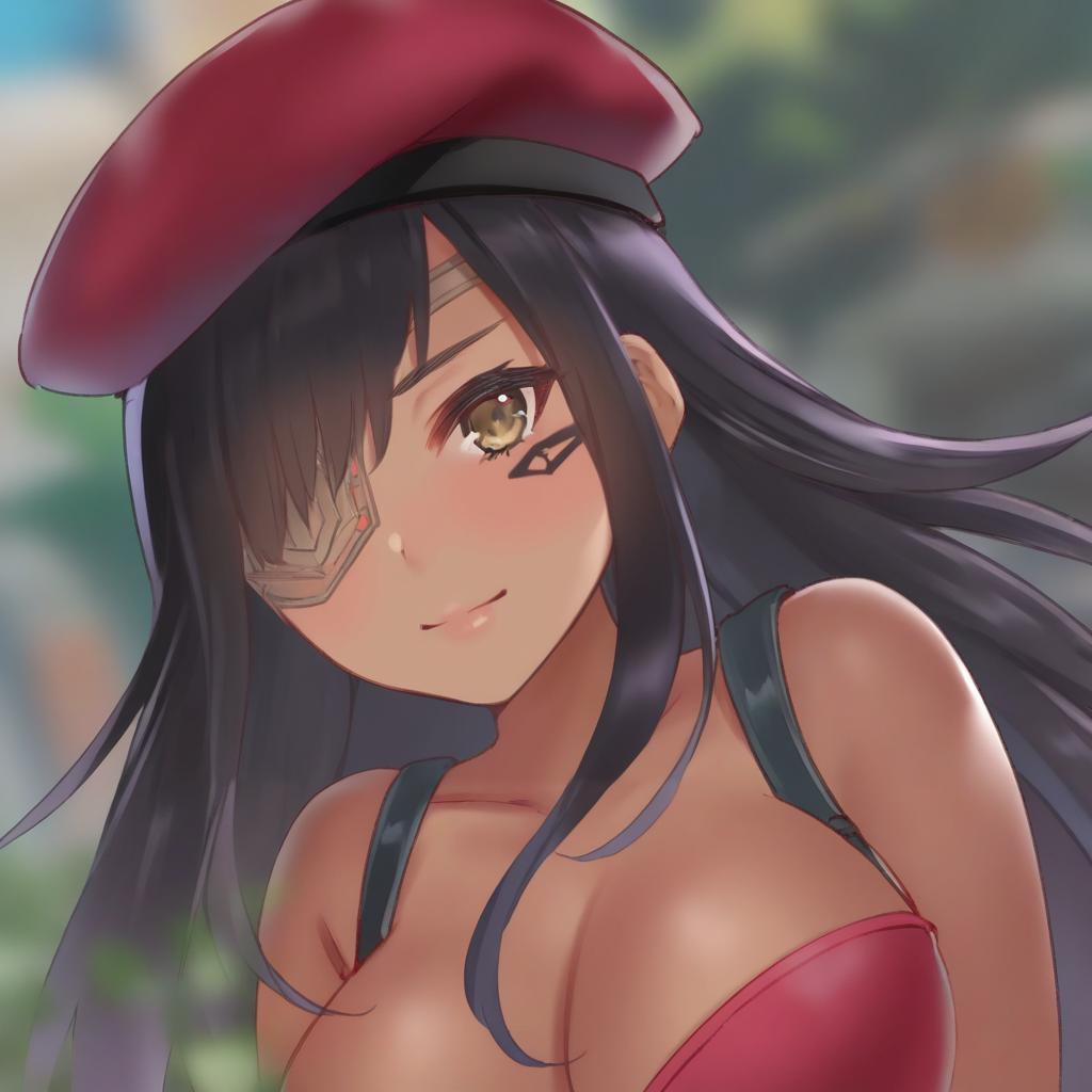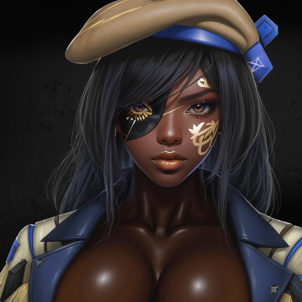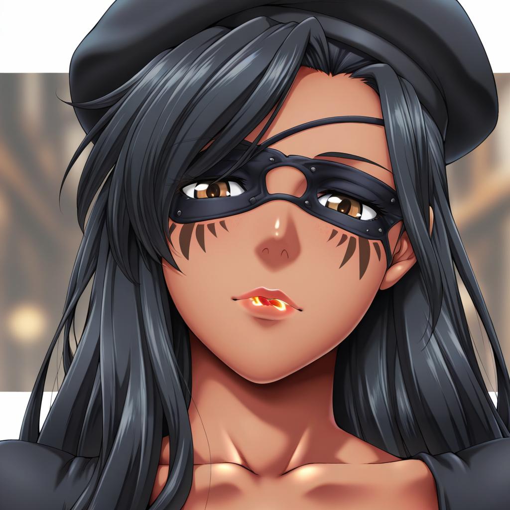 Digital artwork of a dark-skinned anime woman with long black hair, brown eyes, and a black eye mask. She wears a beret and has distinctive facial tattoos around her eyes. The character has large breasts and subtle glowing effects on her lips, all rendered in a detailed and polished anime style.