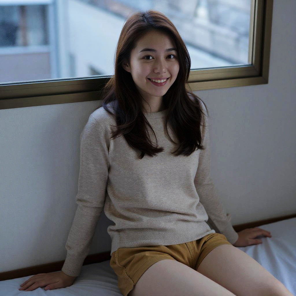 Photograph of a smiling young Asian woman with long dark hair, wearing a beige sweater and yellow shorts, sitting by a window.