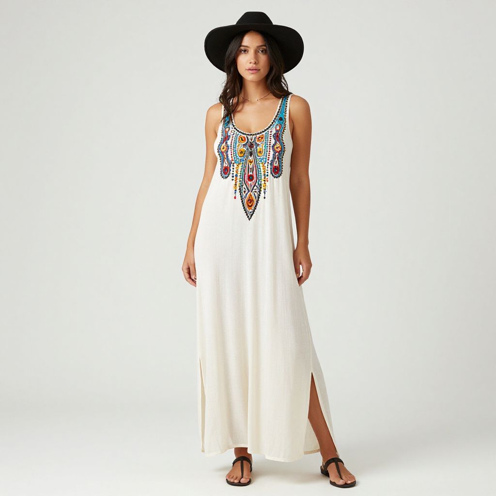 "Woman, bohemian, maxi tank dress in cream color, sleeveless, scoop neckline, multicolored tribal-inspired embroidery at the chest, flowy silhouette, side slits at hem, black wide-brimmed hat, black strappy flat sandals, white studio background.. Sexy. Pretty face and beаutiful eyes. Big breasts."