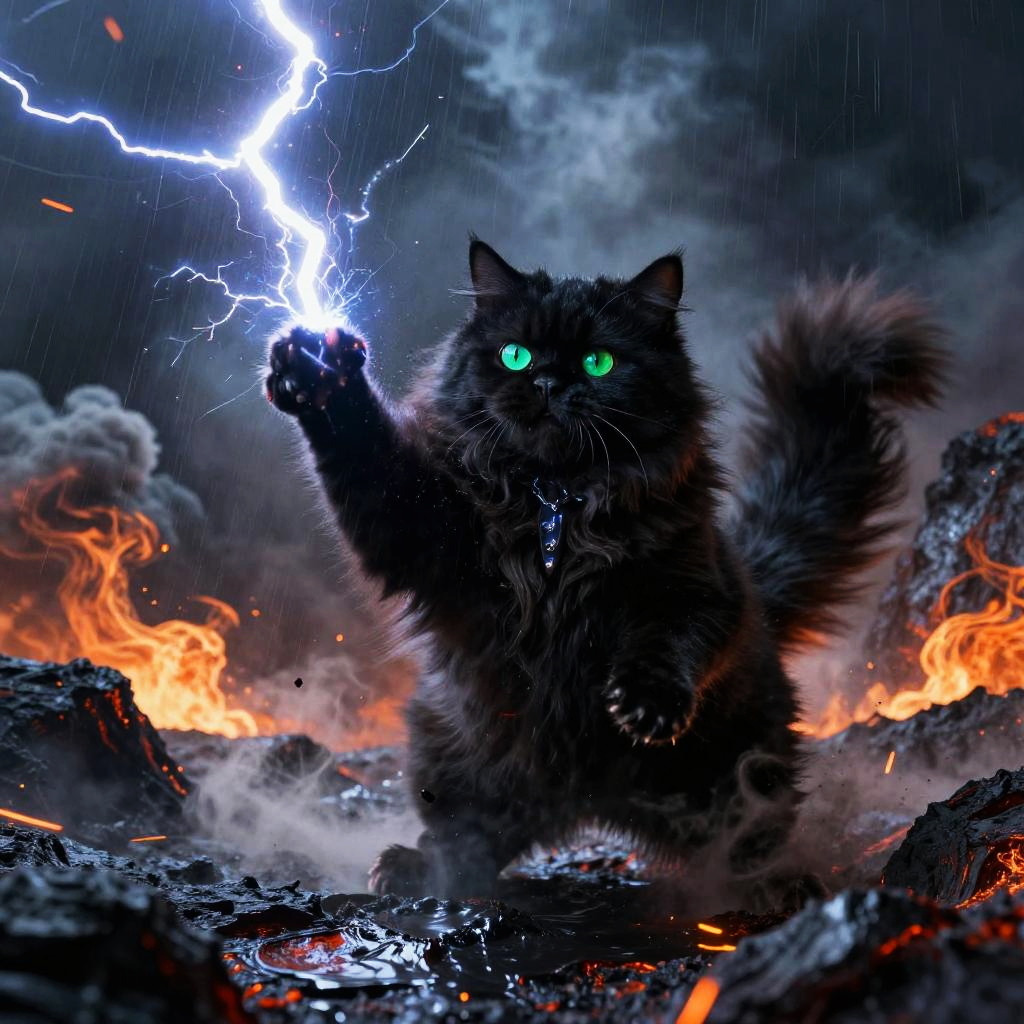 (full body) plump jet-black Persian cat with bright green eyes, arcane warlock epically casting dark lightning spells, in stormy volcanic crater surrounded by whirling ash clouds, black, orange, and blue predominate, hyper-detailing, hyper-realism, tack sharp, cinematic splash screen energy, action-packed composition, dynamic pose, rain and sparks, smoke plumes, glossy reflections, dramatic rim light, volumetric fog, motion blur trails, embers, HDR, film grain, photoreal lighting, rich textures, epic mood