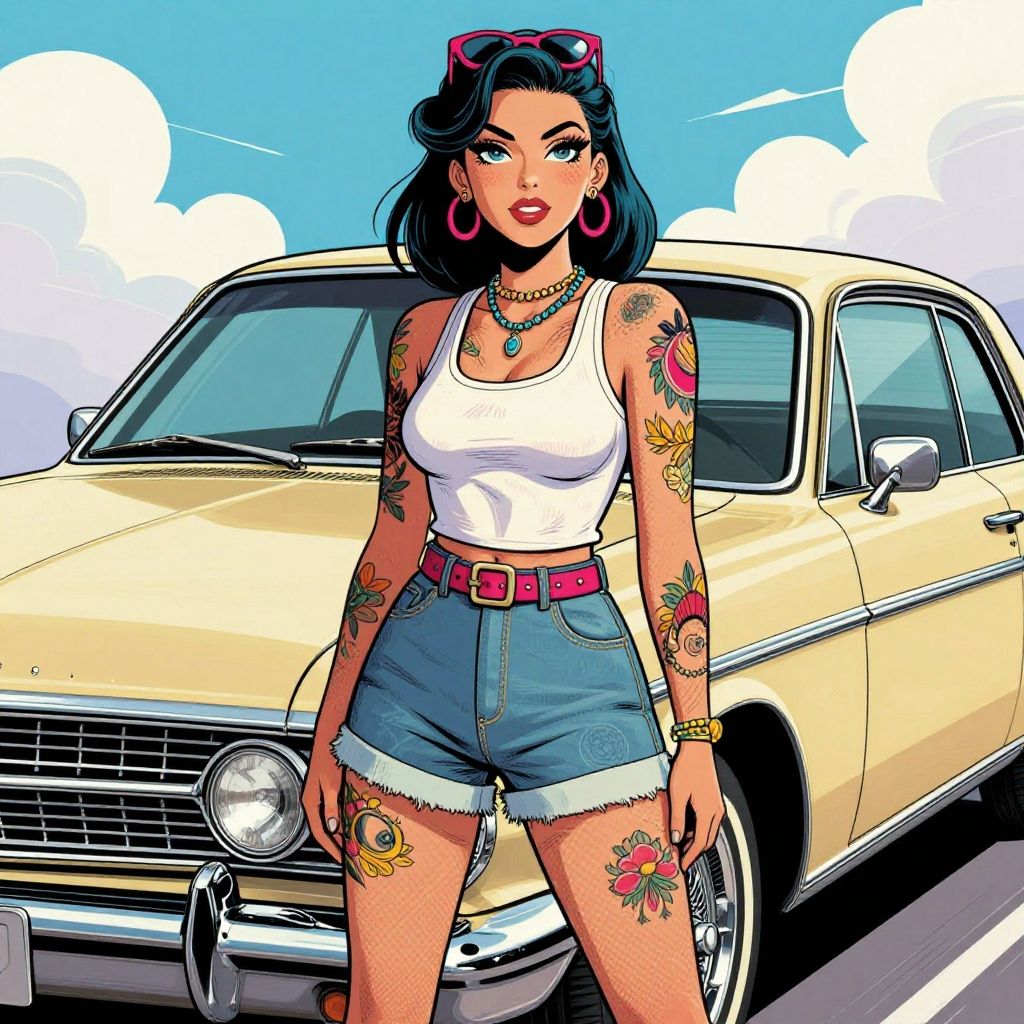 A stylish woman with retro-inspired fashion and colorful tattoos poses confidently in front of a classic vintage car. The illustration features bold lines and vibrant colors with a modern comic book art style, blending classic and contemporary aesthetics.