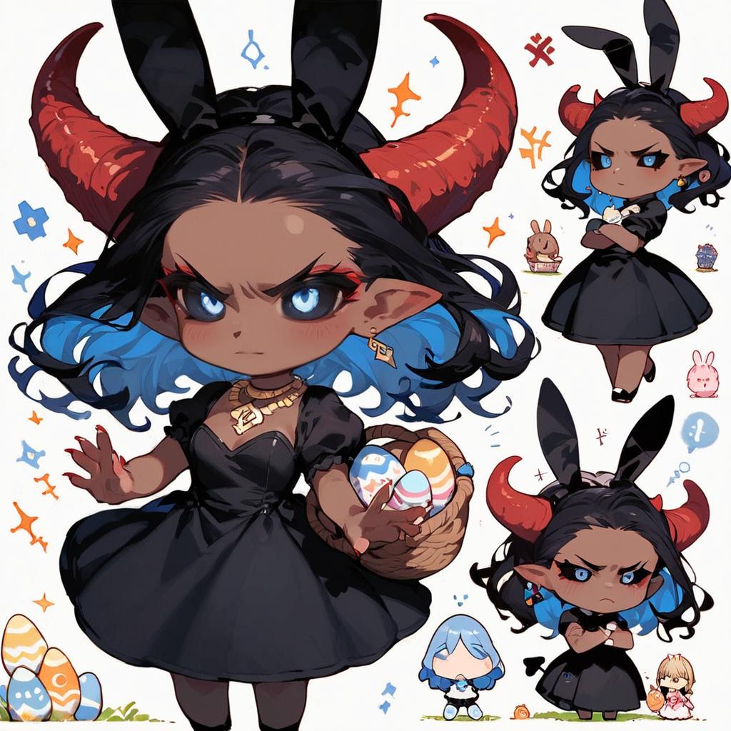 Score_9, score_8_up, source_anime, female, wrenchelegadome, gown, black dress, layered clothing, necklace, solo, dark skin, horn, black sclera, demon, (chibi:1.1), black hair, crossed arms, pouting, angry, cute, tiny, embroidery, multi multicolored hair, multicolored dress, easter egg, basket, fake rabbit ears