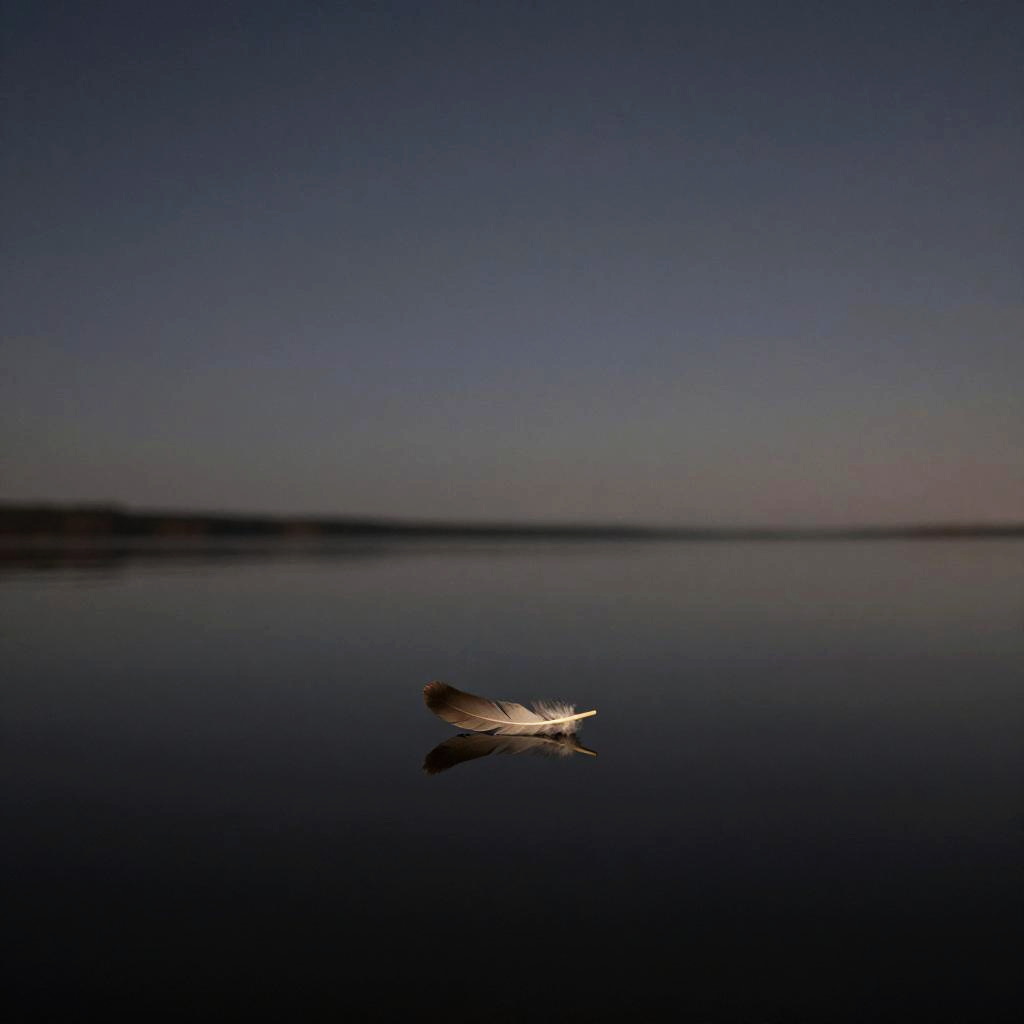 Quiet symbolism portrayed by an empty, tranquil lakeside under a starlit sky, reflective water mirroring minimalist objects such as a single feather floating gently on the surface, muted tones, delicate light effects, evoking peace and subtle depth.