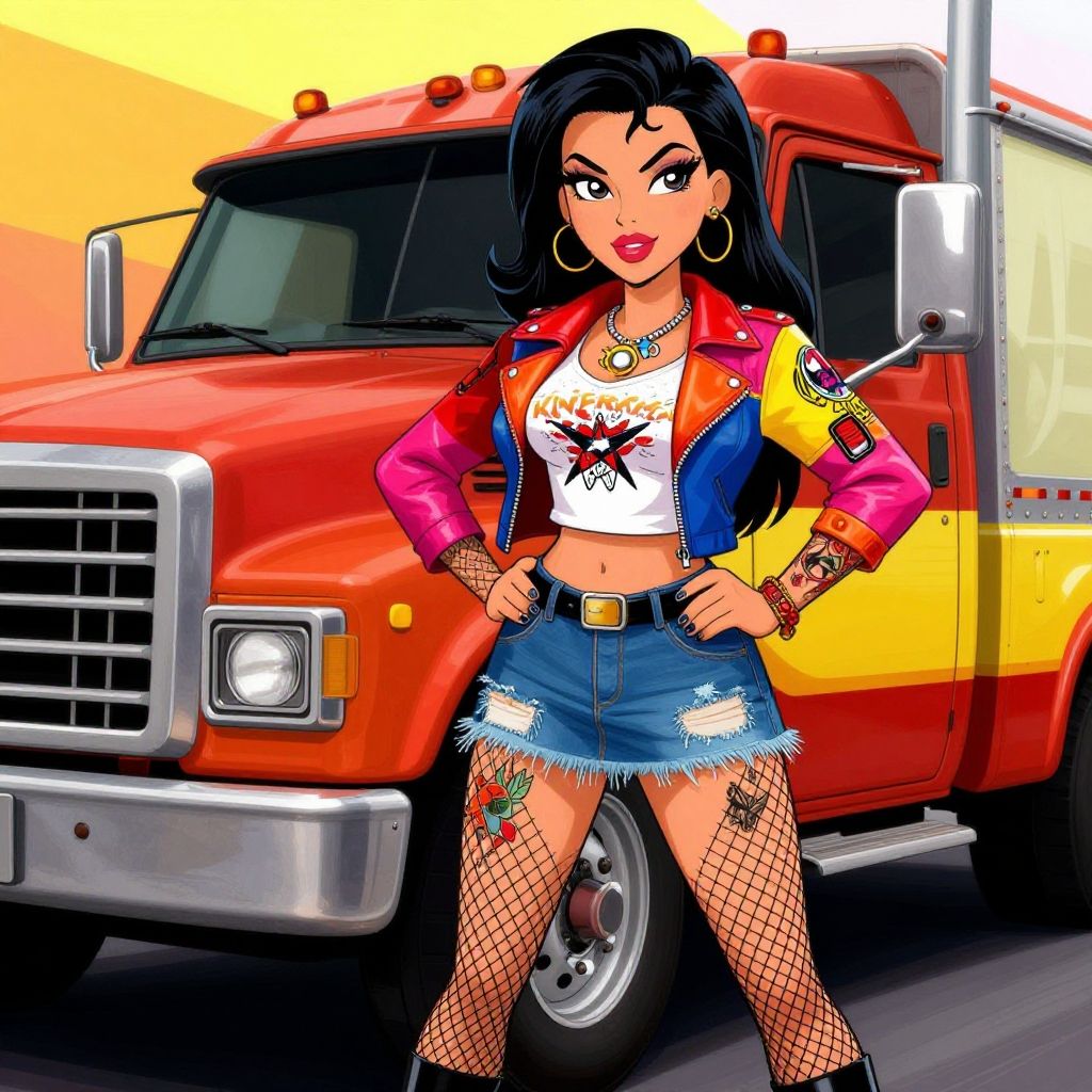 2D cartoon illustration of a confident pin-up woman with long black hair and vibrant tattoos standing next to a rugged 2000s Speed star rig truck. She wears a colorful leather jacket, a white crop top featuring a graphic print, a patched denim mini skirt, and black fishnet stockings. The image features bold vibrant colors and a dynamic composition that conveys a lively and upbeat working girl vibe.