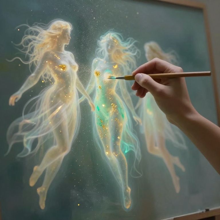 Photograph of a hand holding a paintbrush, creating ethereal, glowing figures of three nude, fair-skinned women with flowing hair on a canvas. The women are illuminated with golden and turquoise light, giving a ghostly, translucent effect. The background is a muted blue-green, and tiny paint specks are visible in the air around the brush. The hand is positioned on the right, mid-stroke, with the women appearing to float and interact with each other in the center. The painting has a delicate, dreamlike quality, emphasizing movement and light.