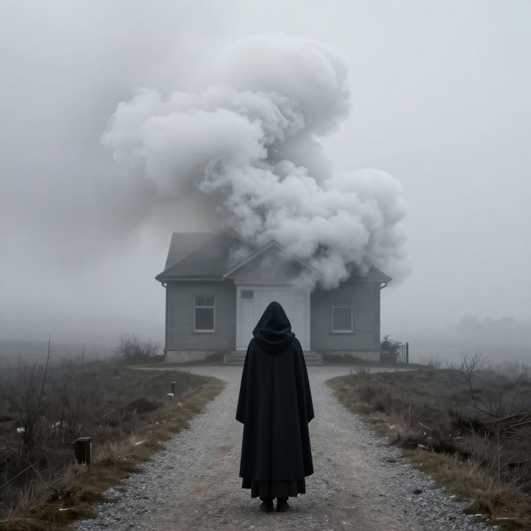 A photograph depicts a mysterious, hooded figure in a long, dark cloak walking towards a small, gray house engulfed in thick, white smoke. The figure's back is to the camera, centered on a gravel path that leads to the house. The overcast sky and foggy atmosphere add a sense of eerie, foreboding. The house, with its simple architecture and darkened windows, is surrounded by barren, winter-like bushes. The overall color palette is muted, with shades of gray, black, and white dominating the scene. The image evokes a sense of suspense and mystery.