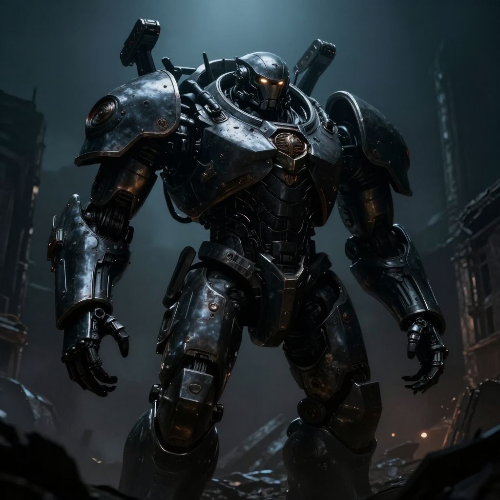 Imperator Titan art depicted in dark, gothic atmosphere, dark metal textures with glowing eyes, futuristic war machine imposing on ruined city, moody cinematic composition