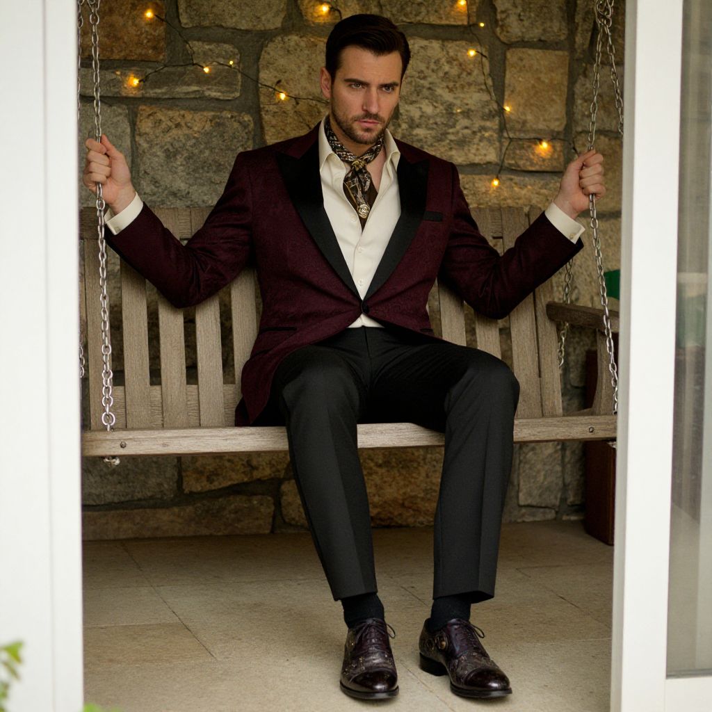 A man, deep burgundy brocade tuxedo jacket, contrasting black lapels, ivory cotton dress shirt, cravat with intricate patterns, tailored black trousers, polished leather dress shoes, subtle steampunk gear motifs, cozy porch swing, rustic stone walls, twinkling fairy lights, lithographic film style, contemplative expression. Man has masculine face and piercing eyes
