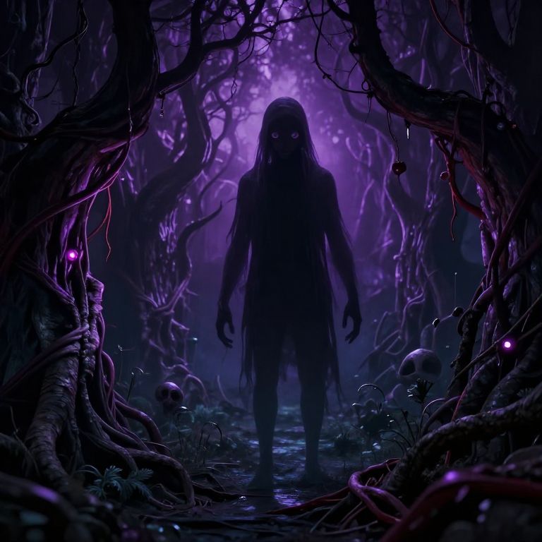 Under a stormy, neon-lit sky, a vast, ancient tree looms, its gnarled branches draped with suspended bodies, each tethered by intricate webs of cables and wires that shimmer in the dim light, The scene blends cyberpunk and dark fantasy horror, with electric hues and iridescent glows casting unsettling reflections on the slick, rain-drenched landscape, Faint, ghostly light beams cut through the fog, revealing the twisted, grotesque details of this dark, dystopian world, Vibrant neon accents contrast sharply with ominous shadows, illuminating the chilling figures hanging silently, their silhouettes outlined by an eerie, greenish glow that pulses with an unsettling, mechanical hum, The atmosphere is charged with suspense, dense fog swirling around the massive tree, amplifying a haunting sense of decay and mystery, Particles float in the damp air, catching the light in vibrant, otherworldly hues, while powerful, dramatic lighting creates dynamic depth, highlighting the distorted bark of the tree and casting long, foreboding shadows across the scene, A perfect fusion of sci-fi horror and vivid cyberpunk, this cinematic, highly detailed masterpiece immerses the viewer in an intense, disturbing atmosphere that hints at a forgotten, haunted past, as if the tree itself harbors ancient secrets of a lost civilization, deep rich colors, color contrast, vibrant, subsurface scattering, bioluminescence, fluorescence, transparency, iridescent, water, reflections, close-up