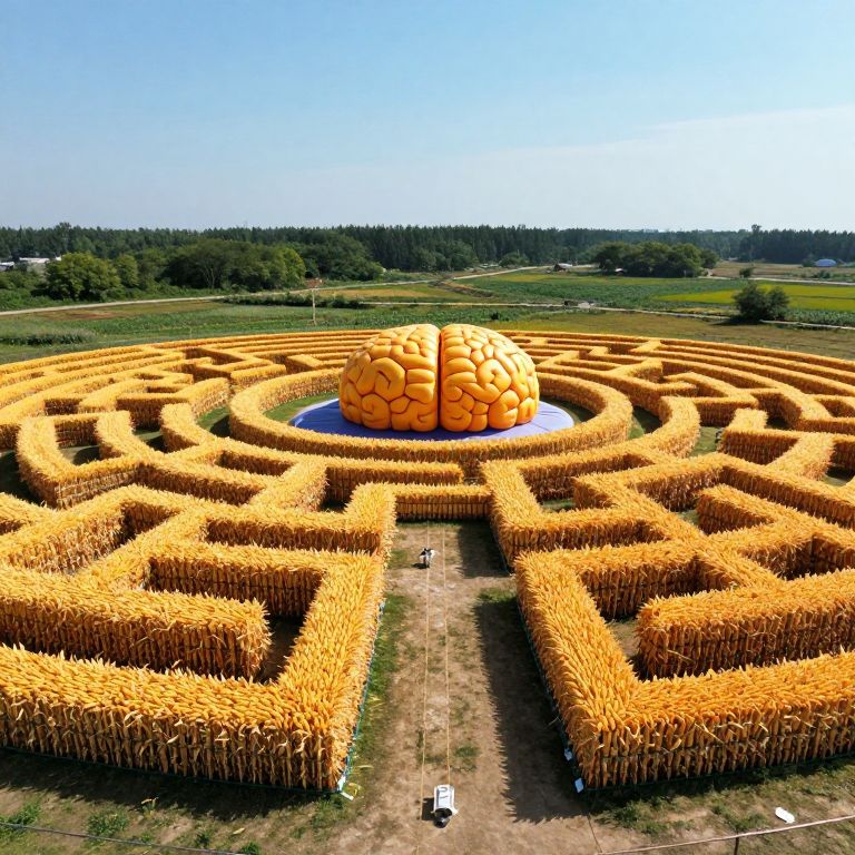 Photograph of a massive, intricate maze made of golden corn stalks, centered with a large, orange, textured dome, set in a lush,
