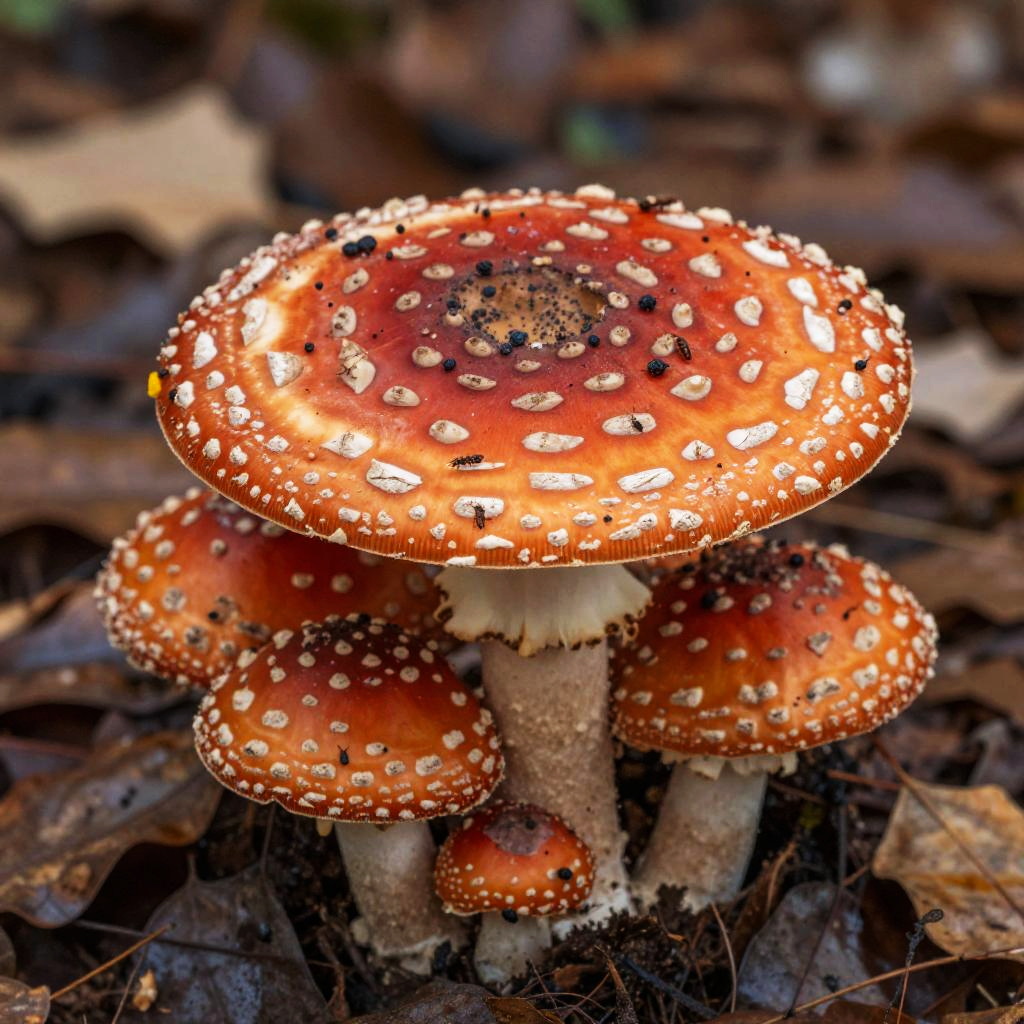 Close-up of a vibrant agaric mushroom cluster on damp forest floor, detailed textured red caps with white spots, surrounded by fallen leaves and tiny insects, natural and realistic style, macro photography inspired