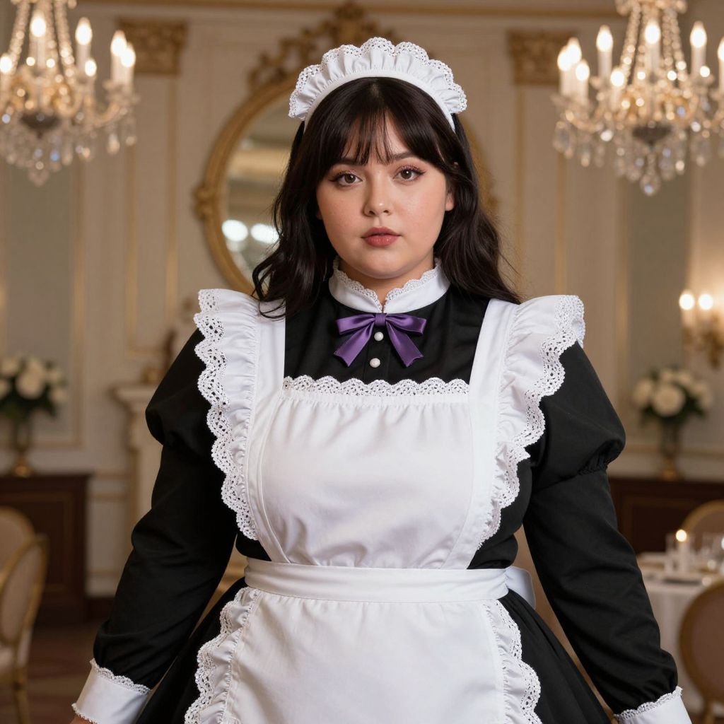 Photorealistic image of a statuesque woman in a detailed fancy maid costume, with a lace-trimmed white apron, a high-necked black dress, and soft purple accents. She has dark brown eyes, full lips, and a calm expression, standing in a dimly lit ballroom with crystal chandeliers and a grand circular mirror, giving off an elegant and regal presence.. The woman has big tits and cute face