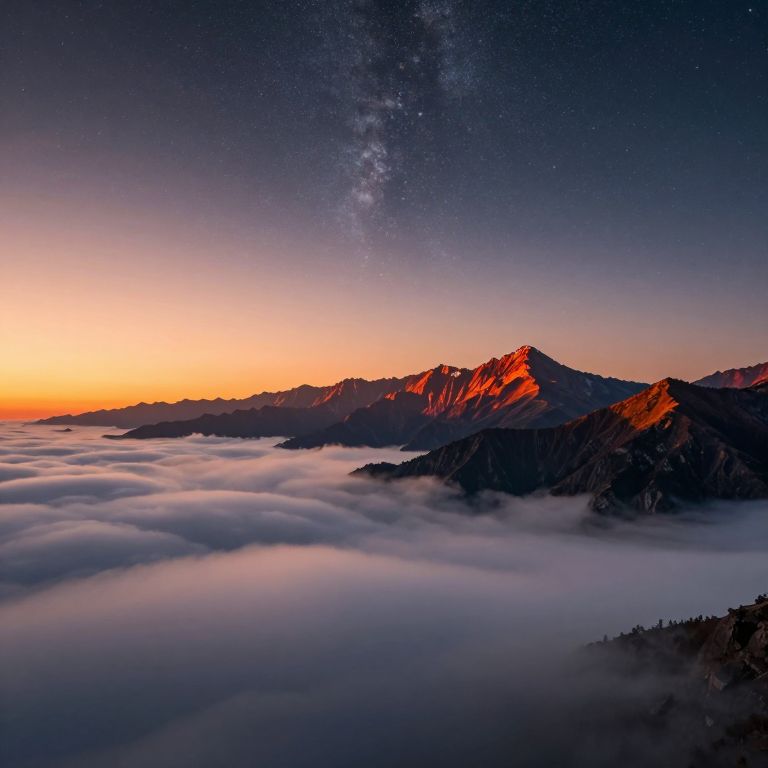 Snow-capped peaks pierce the heavens, suspended above a sea of clouds that mirror their silhouettes like liquid glass, while the cosmos above glimmers with a celestial dance of stars and ethereal light.