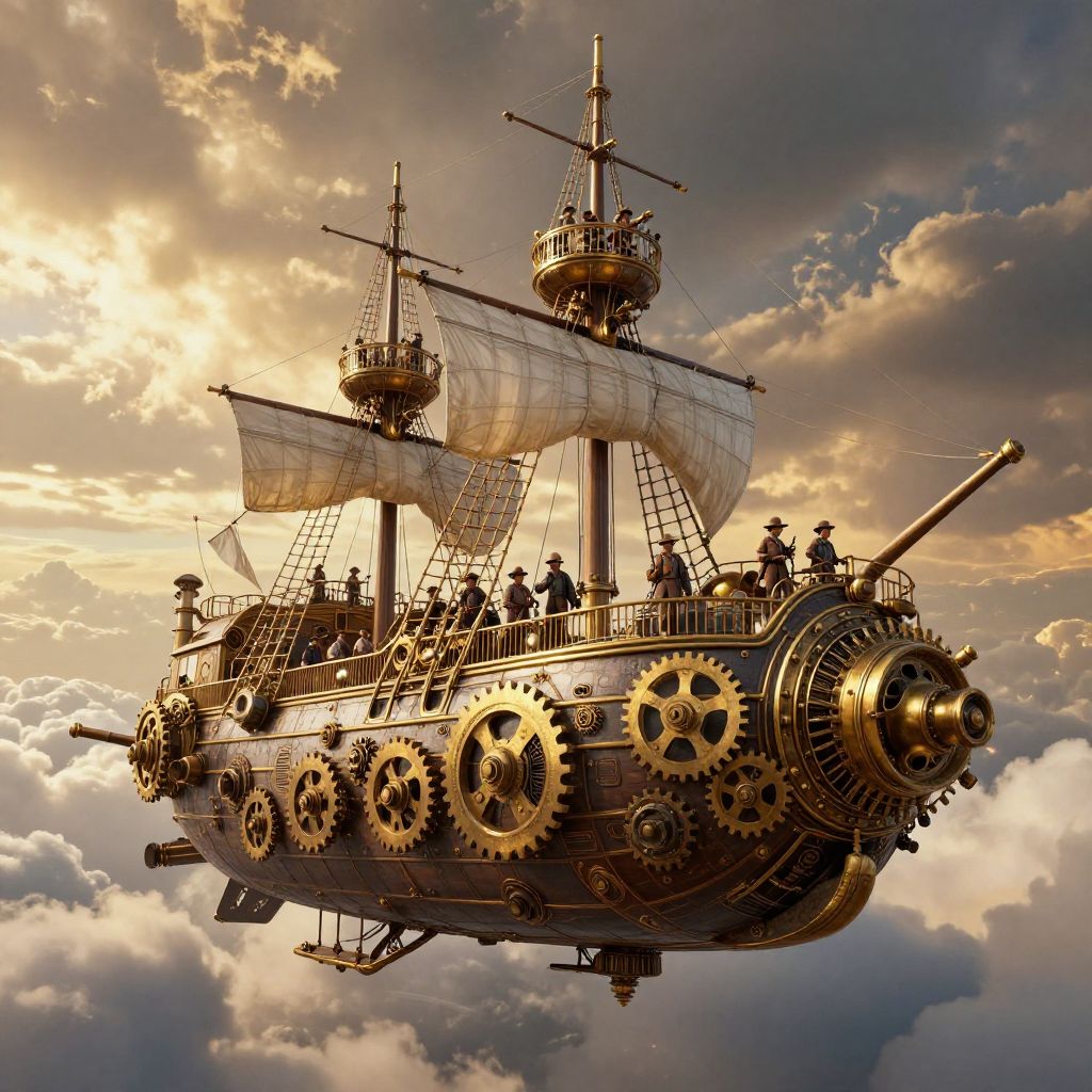 Free AI image generator crafting an intricate steampunk airship floating above the clouds, with brass gears, detailed machinery, and adventurous explorers on deck, under a dramatic sky with warm golden hues and dynamic lighting effects.
