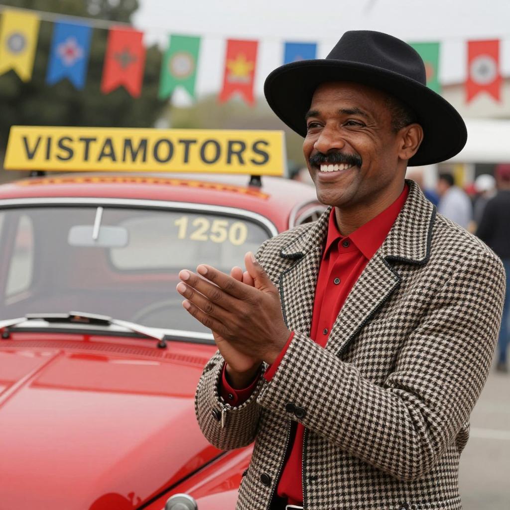Man with dark skin, mustache, wearing black hat, houndstooth jacket, red shirt, claps hands. Red vintage car with yellow "VISTAMOTORS" sign, "1250" on windshield, colorful flags in background. Bright, outdoor setting. Man smiles broadly. 1 person.
