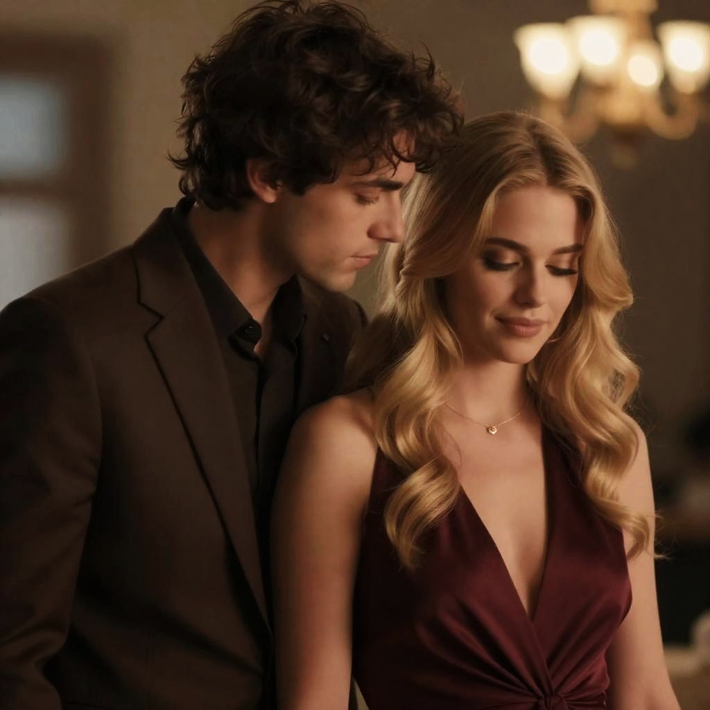 Photograph of a man and woman in a close, intimate pose. The woman with blonde, wavy hair wears a red blouse with black buttons, looking at the man. The man with dark hair, wearing a white shirt and red tie with a pattern, leans toward her. Background includes a blurred Christmas tree with lights. Both have focused, intense expressions.