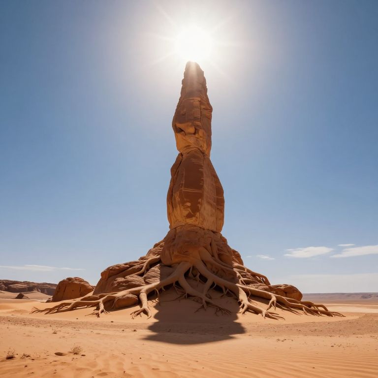 Photograph of a tall, narrow, sandstone monolith standing in a sunlit desert. The monolith, with its distinct vertical shape and textured, weathered surface, is rooted in a sprawling network of exposed, gnarled roots that extend across the sandy ground. The sun, positioned directly above the monolith, creates a bright, almost blinding halo effect around its top. The clear blue sky in the background contrasts with the warm, orange hues of the desert sand. The image captures the stark beauty and isolation of the desert landscape.