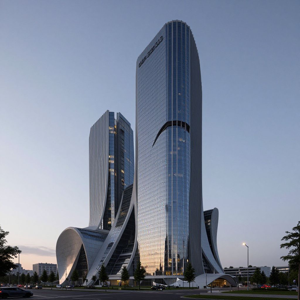 Photograph of two modern, curvilinear glass skyscrapers at dusk, with reflective blue-tinted windows, sleek architecture, and urban surroundings