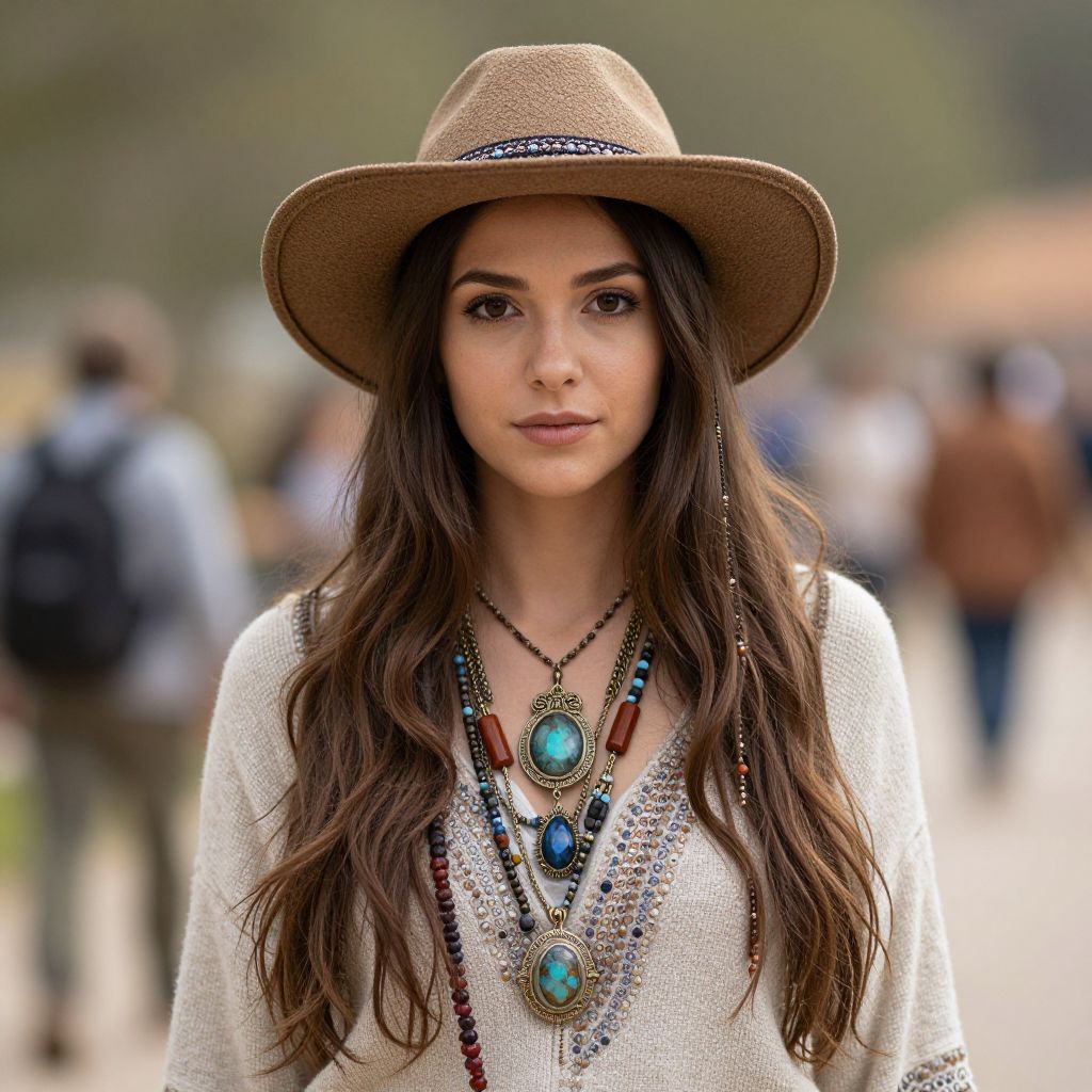 Photograph of a young woman with long brown hair, wearing a beige hat and white knit top, adorned with turquoise necklaces, standing in a blurred