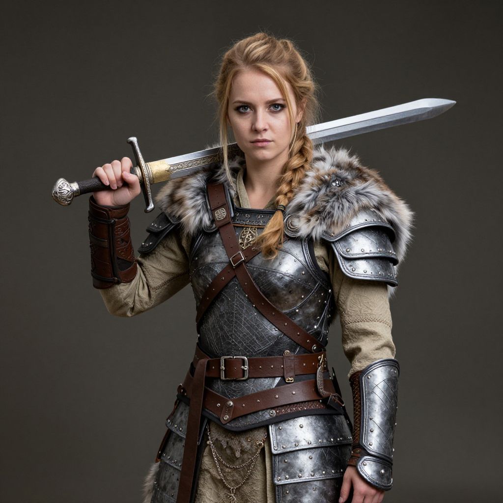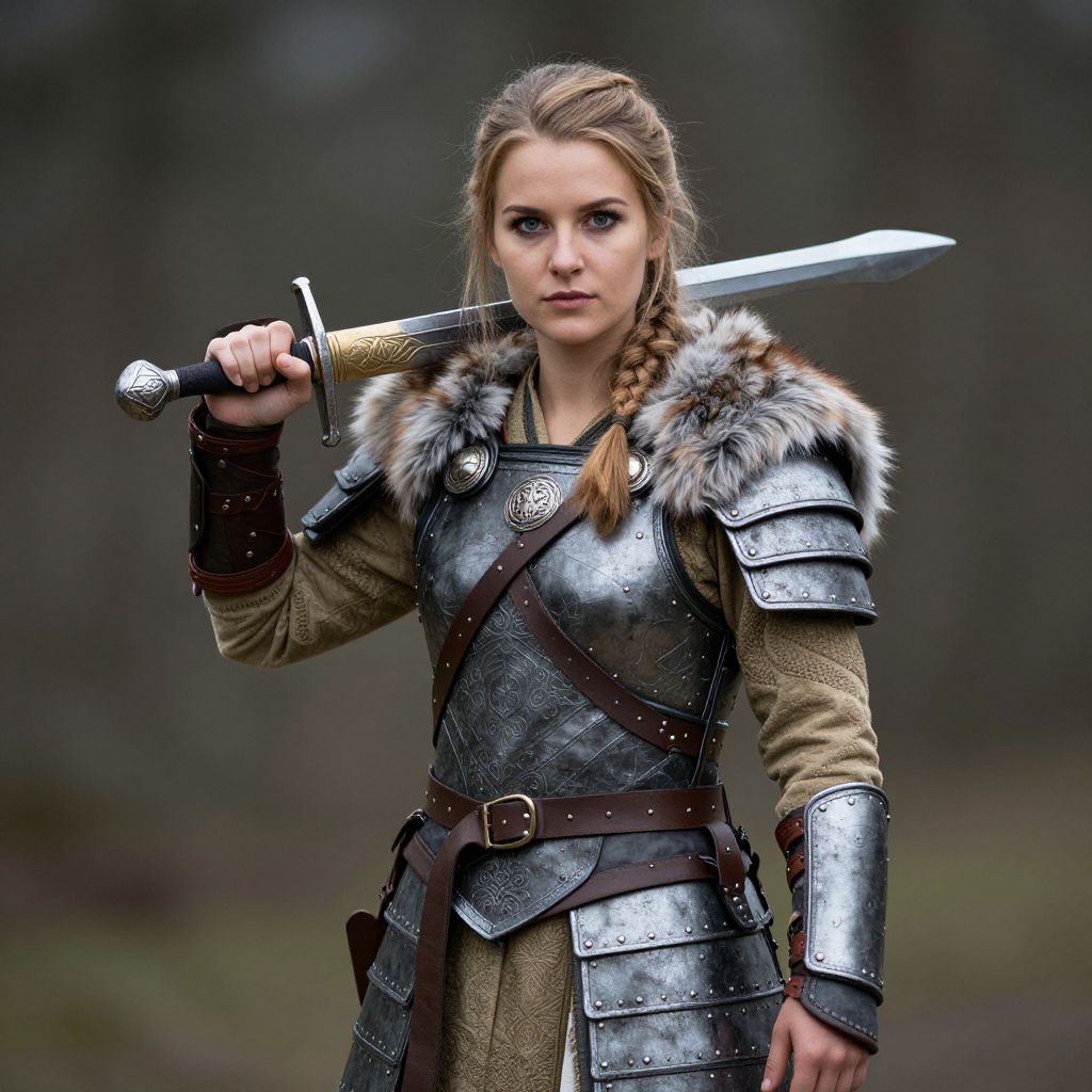 A young woman dressed as a Viking in armor and furs, with a sword over her shoulder
