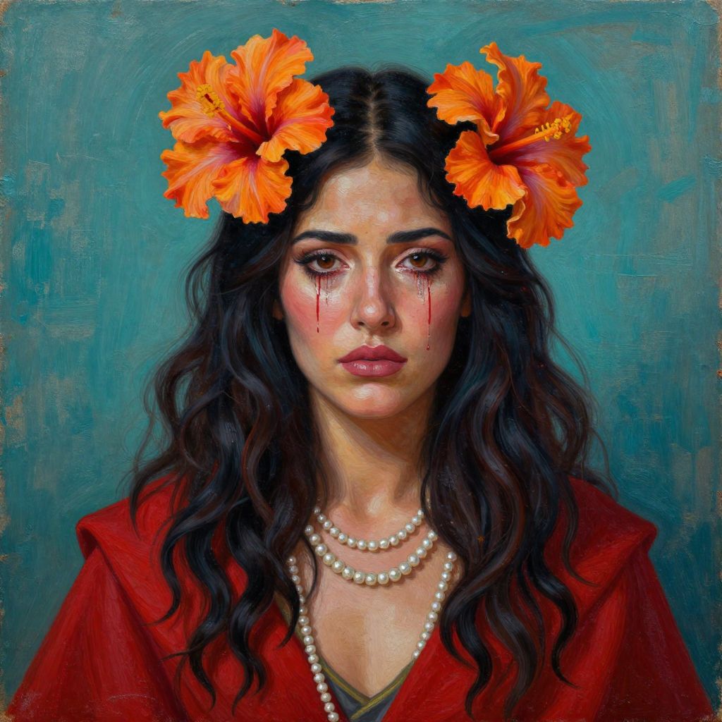 Digital painting of a dark-haired woman with olive skin, wearing orange flowers, a vibrant red and blue bird on her head, and a radiant yellow sun