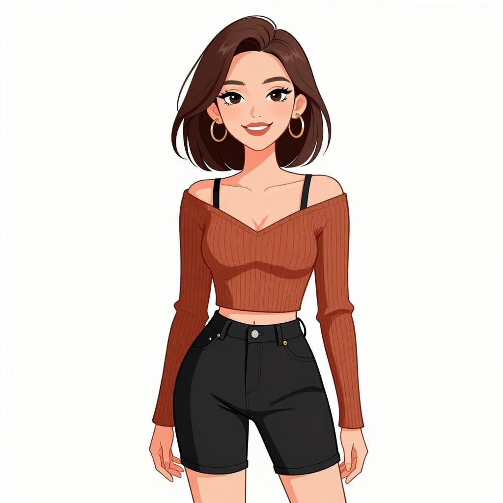 Digital illustration of a young woman with fair skin and short brown hair, styled in a bob cut. She wears a strapless, dark burgundy crop top, revealing a slender midriff, and high-waisted, brown plaid pants that end just above her ankles. Her outfit is paired with black ankle boots and large hoop earrings. She stands confidently with a slight smile, her arms relaxed by her sides. The background is plain white, making the character the focal point. The art style is vibrant and modern, with clean lines and bold colors.