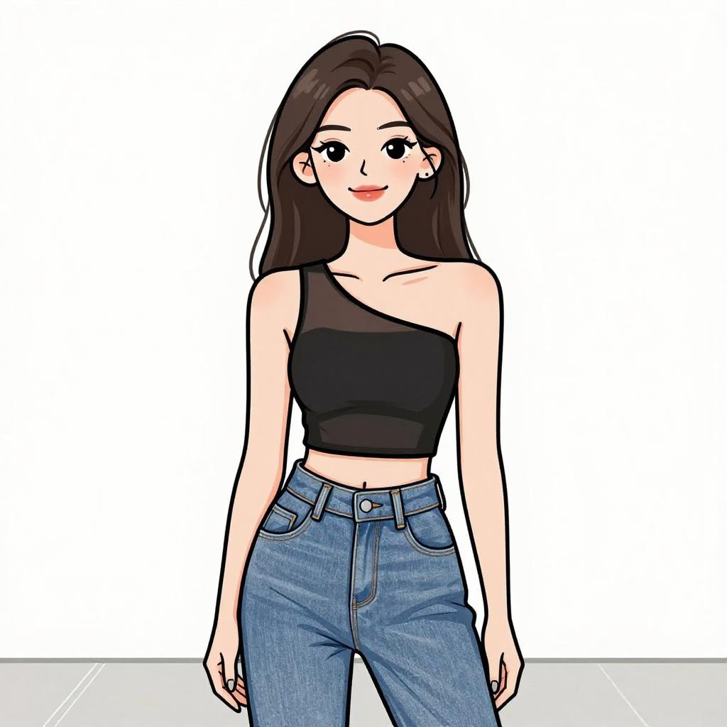 Digital illustration of a young woman with short brown hair, wearing a strapless burgundy top, high-waisted plaid pants, and black ankle