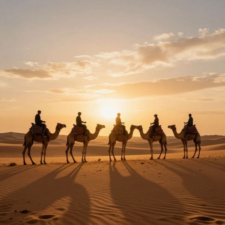 Travelers ride inverted camel silhouettes across a surreal, gravity-defying desert landscape, set against a golden-hour sky with dramatic lighting and a liquid-like horizon, rendered in a digital art style with high-definition clarity.