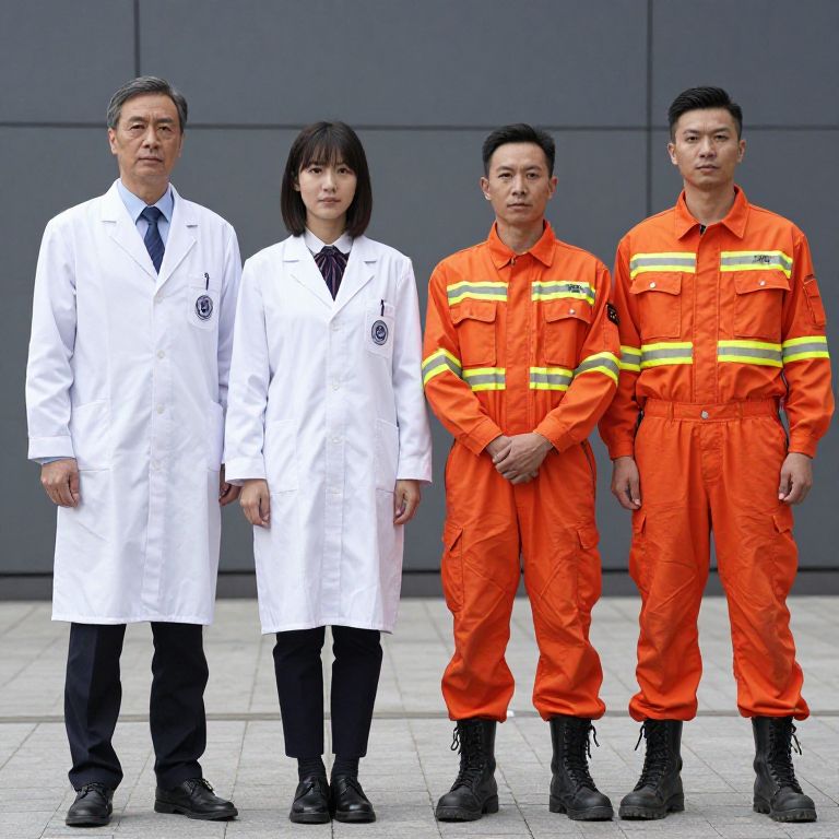 Photograph of four Asian individuals standing in a row against a dark gray wall. From left to right: an older man with short gray hair in a white lab coat and black pants, a young woman with straight black hair in a white lab coat and black tie, a middle-aged man with short black hair in an orange firefighter uniform with yellow reflective stripes, and another middle-aged man with short black hair in an orange firefighter uniform. They stand on a light gray tiled floor, all wearing black boots. The lab coats have a small emblem on the left side.