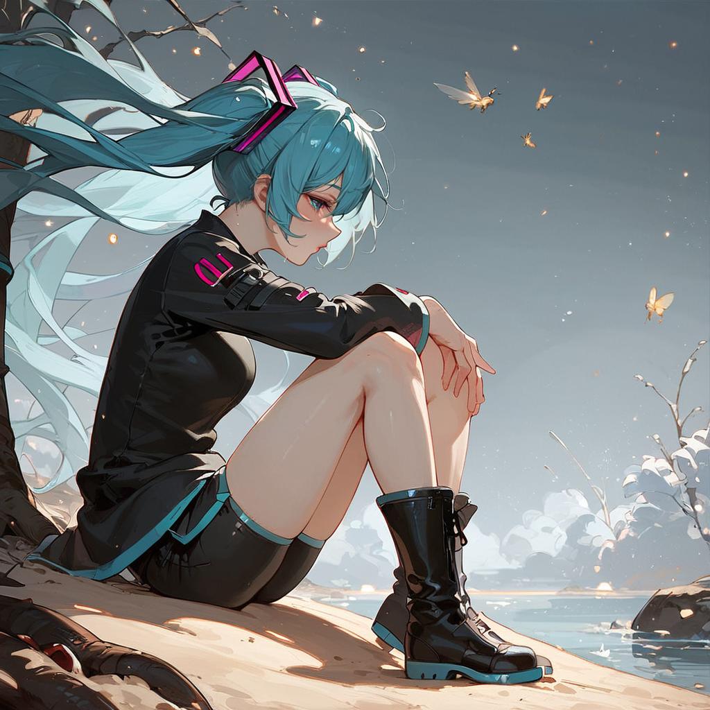 Score_9, source_anime, fireflies, glowing, outdoors, sand, trees, night sky, looking away, sitting, long shadows, from side, 1girl, solo, hatsune miku, aqua hair, aqua eyes, bare legs, boots, t-shirt, shorts, short sleeves