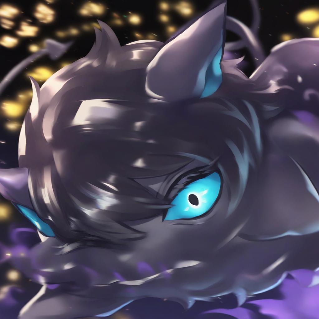 Grim (twisted wonderland), twisted wonderland, no humans, 1boy, demon tail, cat ears, blue eyes, hair between eyes, black hair, virtual youtuber, cat, blue sclera, creature, by artist sakuramochi (sakura frappe), dark_illustrious
