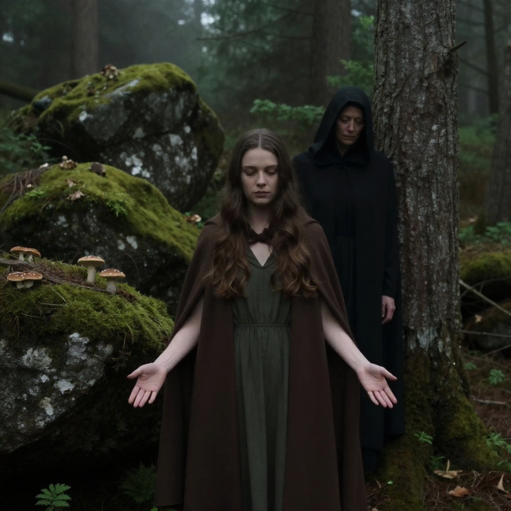 Two women in a dark forest. Young woman in front with long brown hair, green dress, and brown cloak. Older woman in back, shrouded in black, leaning against tree. Mossy rocks, mushrooms, foggy atmosphere. Older woman's face partially obscured. Young woman's hands open, arms slightly out. Dense underbrush and tree trunks surround.