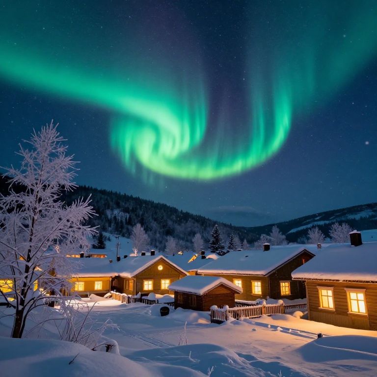Photograph of a snowy, nighttime Scandinavian village under a vivid display of green Northern Lights. Wooden cabins with glowing yellow windows are scattered across a snow-covered landscape. Frosty trees and a wooden fence frame the foreground. The background reveals a dark forest and rolling hills. The sky is a deep navy blue, dotted with stars, and the Northern Lights swirl dramatically above. The warm cabin lights contrast with the cool, ethereal glow of the aurora, creating a serene, magical winter scene.