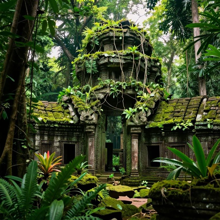 Photograph of an ancient, moss-covered stone temple deep in a lush, dense jungle, with vibrant green foliage and sunlight filtering through trees.