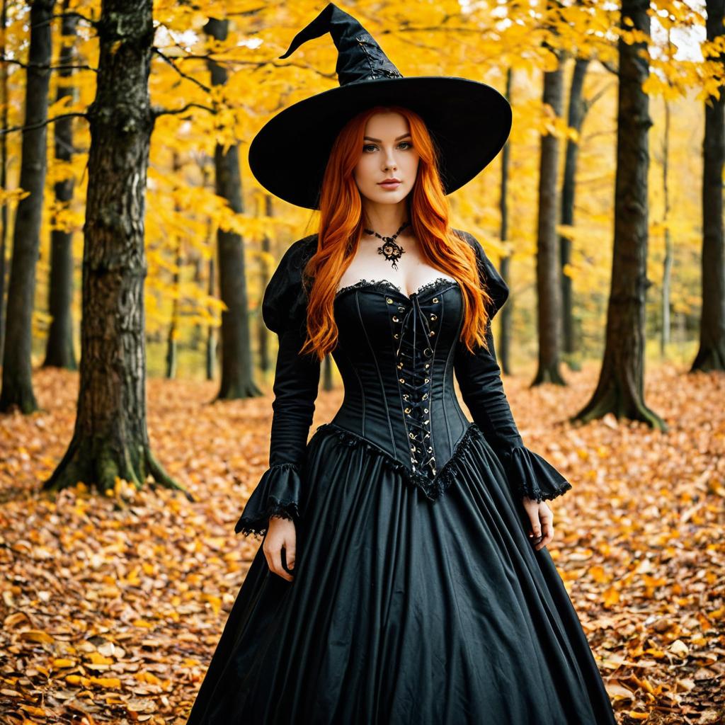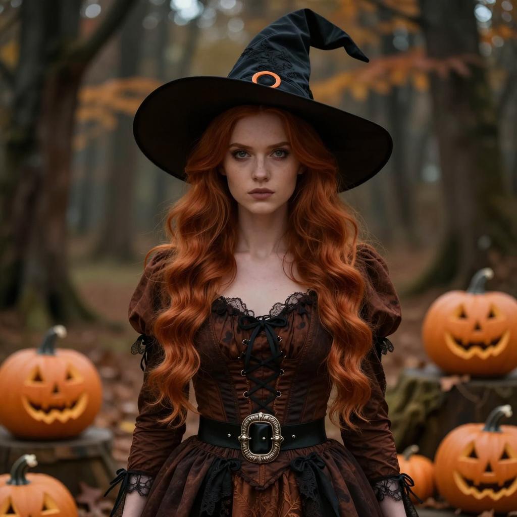 Common halloween costume, photo-realistic, digital art, young woman, long red hair, wavy, witch hat, dark brown dress, lace-up bodice, black belt, ornate buckle, fantasy setting, dimly lit, autumnal forest background, blurry pumpkins, serious expression, soft lighting, realistic ures, warm colors, slightly dark and moody atmosphere, high detail, fantasy character, magical realism style