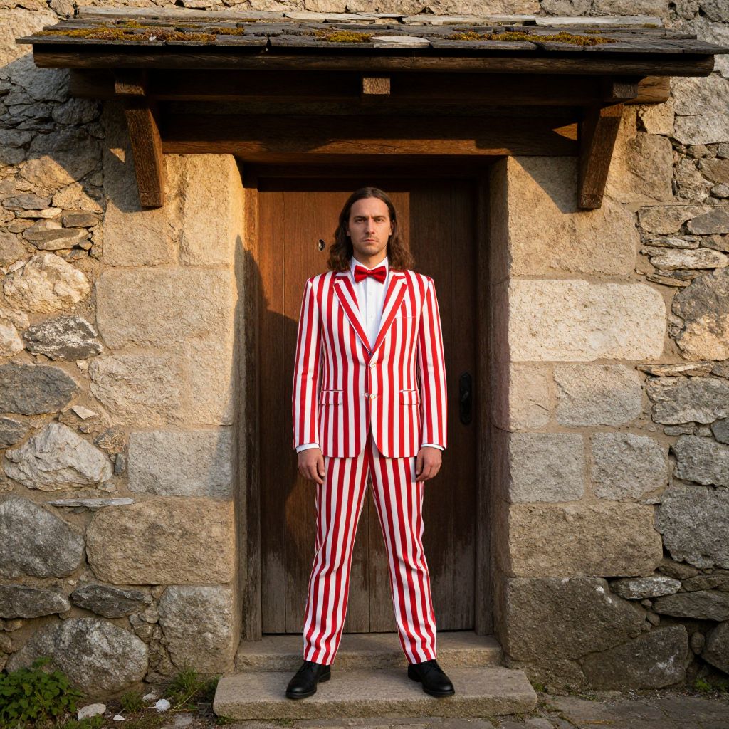 A photograph of a man with long brown hair standing in front of a rustic stone building with a wooden door. He's wearing a red and white striped suit, black shoes, and a red bow tie. The sunlight casts a warm glow on the stone and moss-covered roof, creating a contrast with the man's vivid outfit. He's looking directly at the camera with a serious expression.