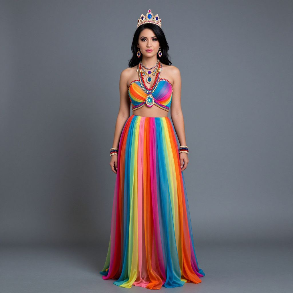 Photograph of a young woman with medium brown skin and long black hair, wearing a silver tiara. She is dressed in a vibrant, rainbow-colored, floor-length gown with a multi-colored, pleated skirt and a matching, heart-shaped, strapless top adorned with red and blue gems. She accessorizes with multiple red and blue beaded bracelets on her right wrist and a red choker necklace. The background is a plain, gradient gray. The woman stands facing forward, exuding confidence and elegance. The image has a studio lighting setup, highlighting the vivid colors and textures of her attire.